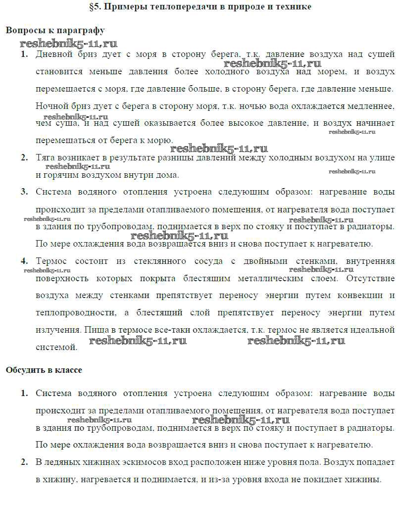Готовая домашняя работа с ответами по Физике за 8 класс Громов, Родина, Белага Учебник Просвещение 2018 ФГОС - Параграфы § 5. Примеры теплопередачи в природе и технике