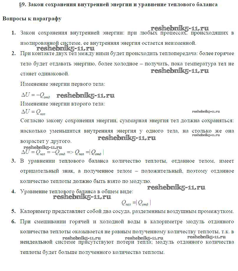 Готовая домашняя работа с ответами по Физике за 8 класс Громов, Родина, Белага Учебник Просвещение 2018 ФГОС - Параграфы § 9. Закон сохранения внутренней энергии и уравнение теплового баланса