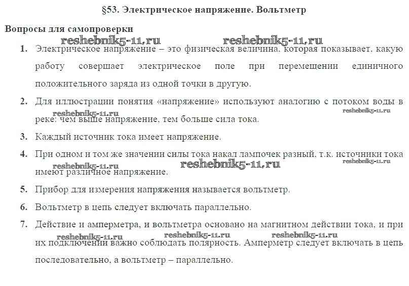 Готовая домашняя работа с ответами по Физике за 8 класс Пурышева, Важеевская Учебник Вертикаль Дрофа 2017 ФГОС - Вопросы к параграфам § 53. Электрическое напряжение. Вольтметр
