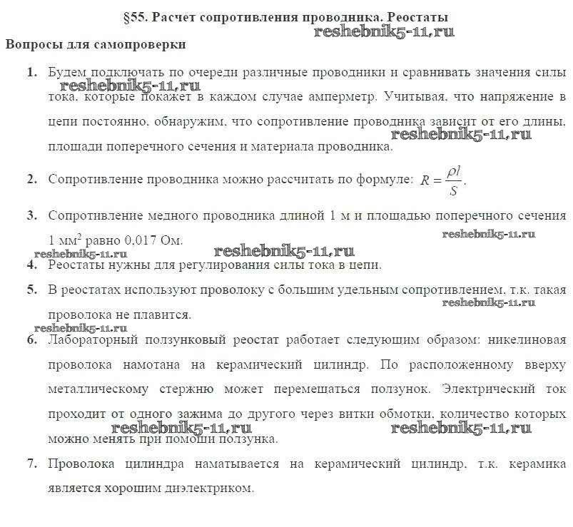 Готовая домашняя работа с ответами по Физике за 8 класс Пурышева, Важеевская Учебник Вертикаль Дрофа 2017 ФГОС - Вопросы к параграфам § 55. Расчет сопротивления проводника. Реостаты