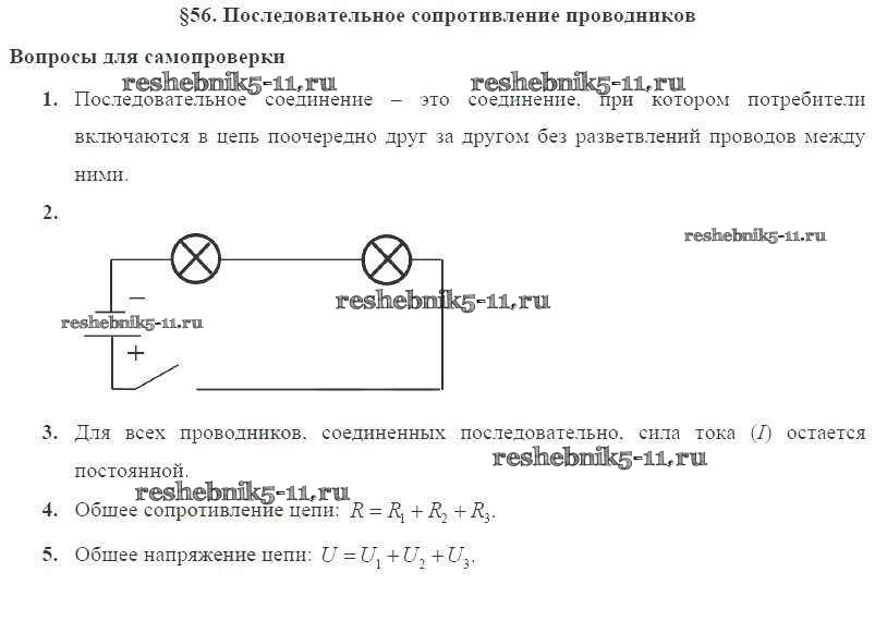 Готовая домашняя работа с ответами по Физике за 8 класс Пурышева, Важеевская Учебник Вертикаль Дрофа 2017 ФГОС - Вопросы к параграфам § 56. Последовательное сопротивление проводников