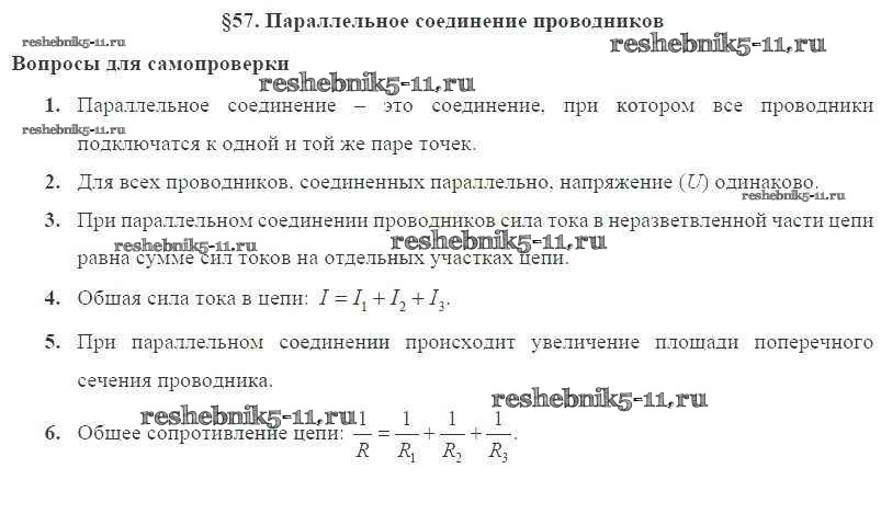 Готовая домашняя работа с ответами по Физике за 8 класс Пурышева, Важеевская Учебник Вертикаль Дрофа 2017 ФГОС - Вопросы к параграфам § 57. Параллельное соединение проводников