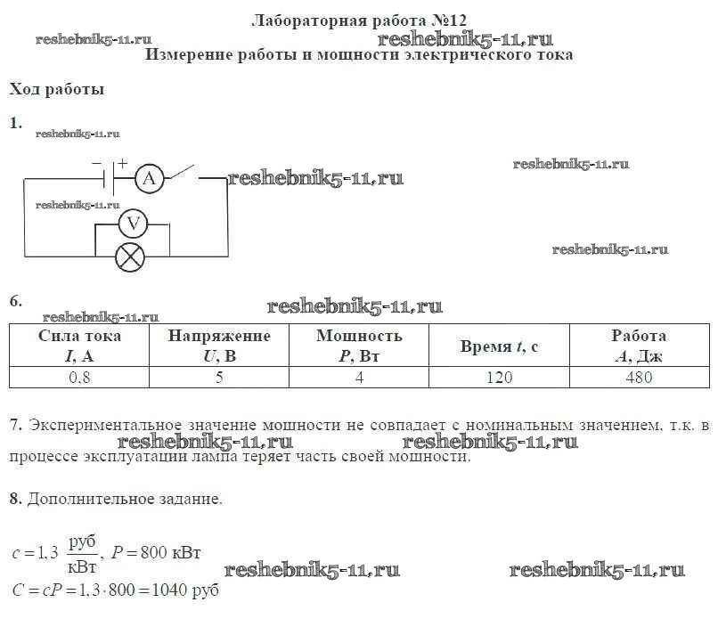 Готовая домашняя работа с ответами по Физике за 8 класс Пурышева, Важеевская Учебник Вертикаль Дрофа 2017 ФГОС - Лабораторные работы ЛР №12. Измерение работы и мощности электрического тока