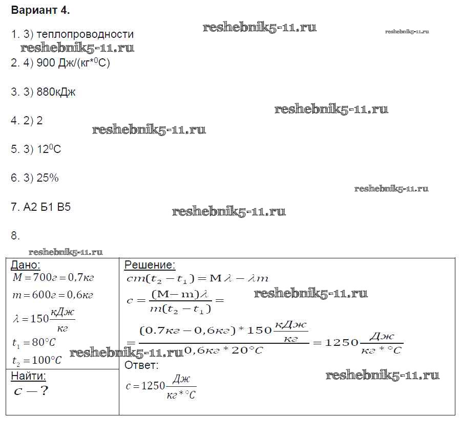 Готовая домашняя работа с ответами по Физике за 8 класс Громцева Контрольные и самостоятельные работы УМК Экзамен 2017 ФГОС - Глава 1. Тепловые явления вариант-4
