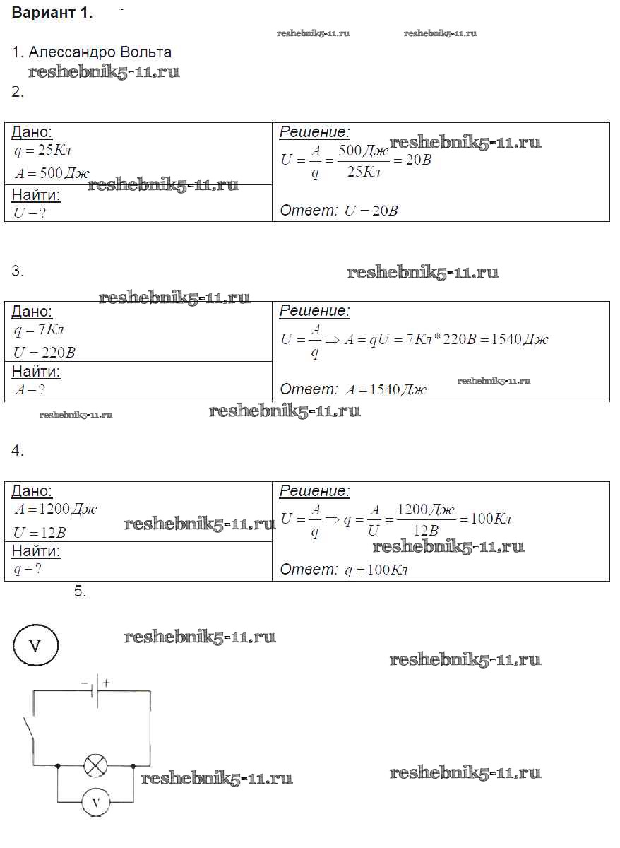 Готовая домашняя работа с ответами по Физике за 8 класс Громцева Контрольные и самостоятельные работы УМК Экзамен 2017 ФГОС - СР №31. Электрическое напряжение. Единицы напряжения. Вольтметр. Измерение силы тока вариант-1