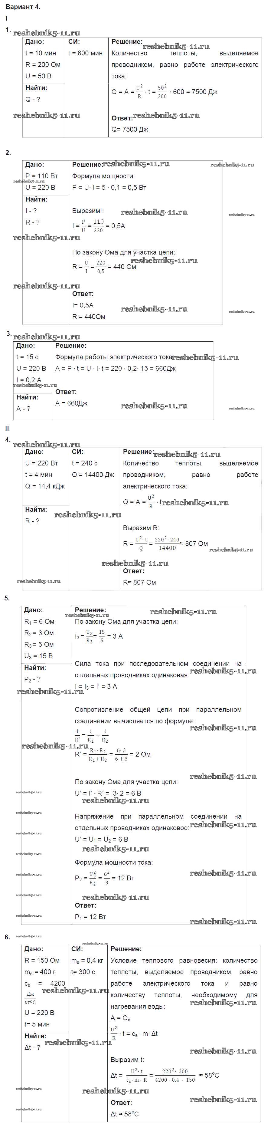 Готовая домашняя работа с ответами по Физике за 8 класс Марон Дидактические материалы Вертикаль Дрофа 2016 ФГОС - КР №4. Работа и мощность тока. Варианты 4