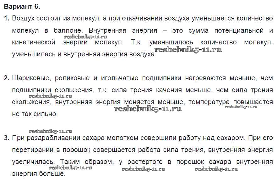 Готовая домашняя работа с ответами по Физике за 8 класс Марон Дидактические материалы Вертикаль Дрофа 2016 ФГОС - СР №1. Внутренняя энергия. Варианты 6