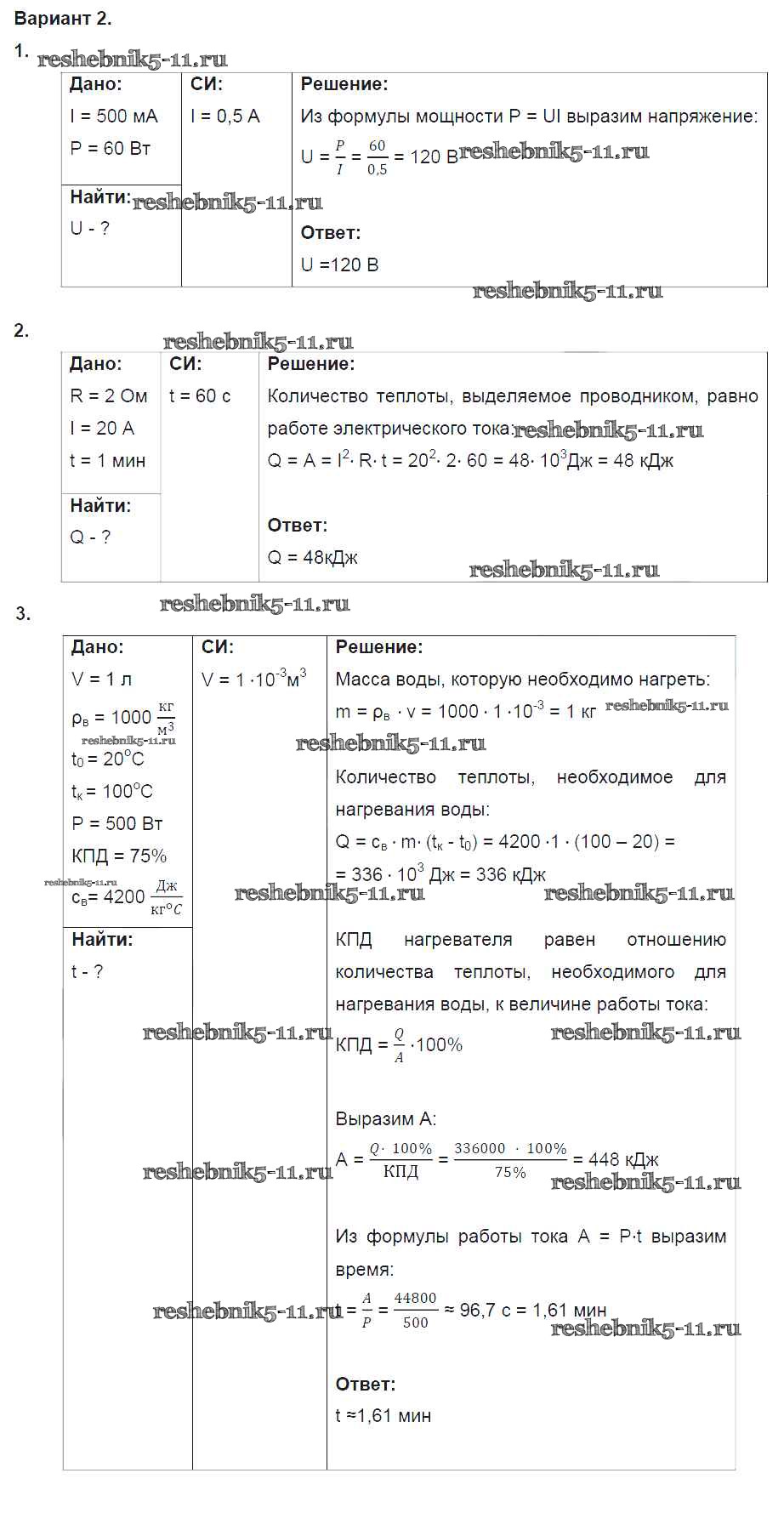 Готовая домашняя работа с ответами по Физике за 8 класс Марон Дидактические материалы Вертикаль Дрофа 2016 ФГОС - СР №10. Работа и мощность тока. Варианты 2