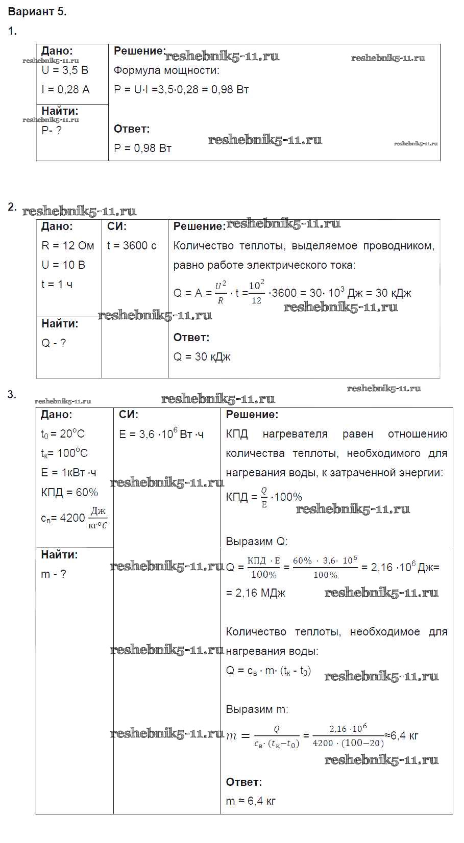 Готовая домашняя работа с ответами по Физике за 8 класс Марон Дидактические материалы Вертикаль Дрофа 2016 ФГОС - СР №10. Работа и мощность тока. Варианты 5