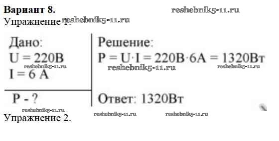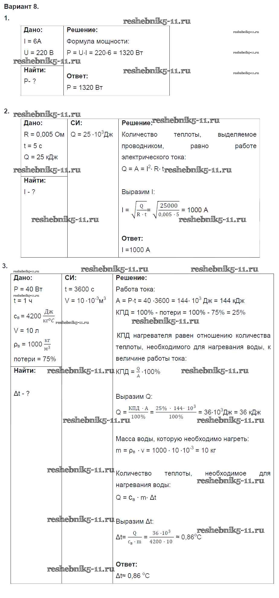 Готовая домашняя работа с ответами по Физике за 8 класс Марон Дидактические материалы Вертикаль Дрофа 2016 ФГОС - СР №10. Работа и мощность тока. Варианты 8