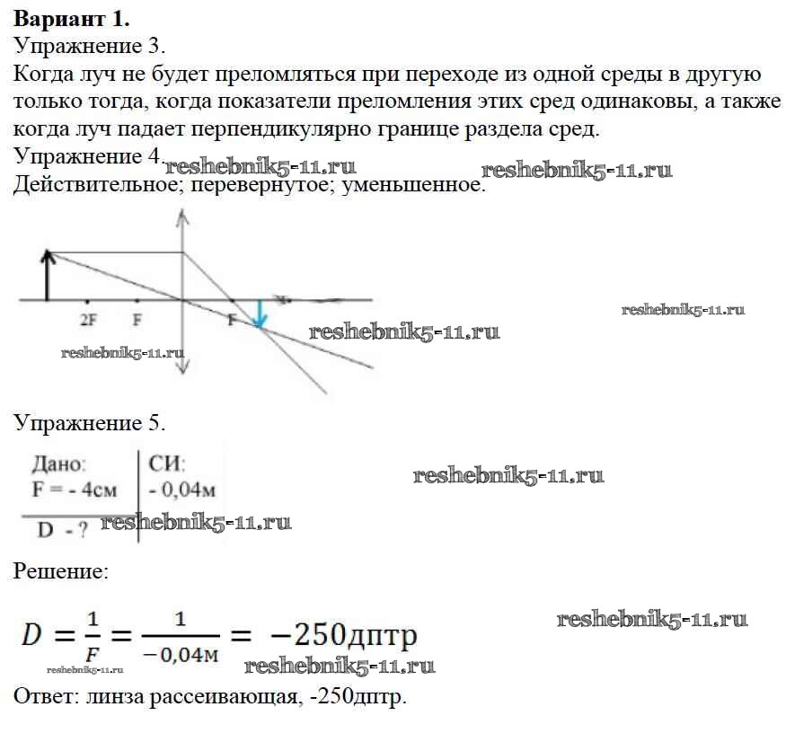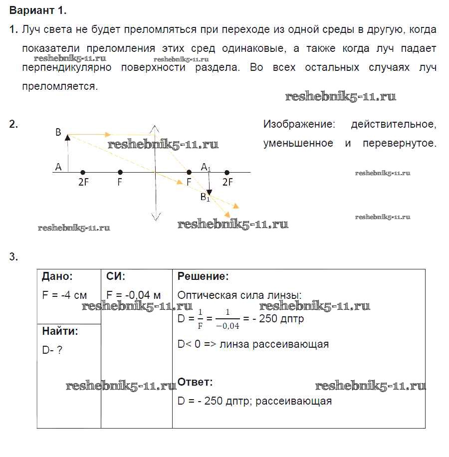 Готовая домашняя работа с ответами по Физике за 8 класс Марон Дидактические материалы Вертикаль Дрофа 2016 ФГОС - СР №13. Преломление света. Линзы. Варианты 1