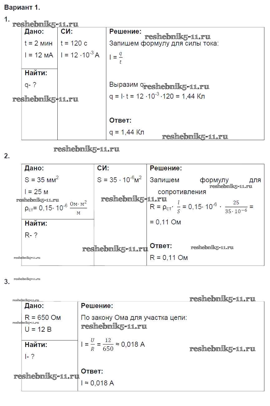 Готовая домашняя работа с ответами по Физике за 8 класс Марон Дидактические материалы Вертикаль Дрофа 2016 ФГОС - СР №8. Сила тока. Напряжение. Закон Ома для участка цепи Варианты 1