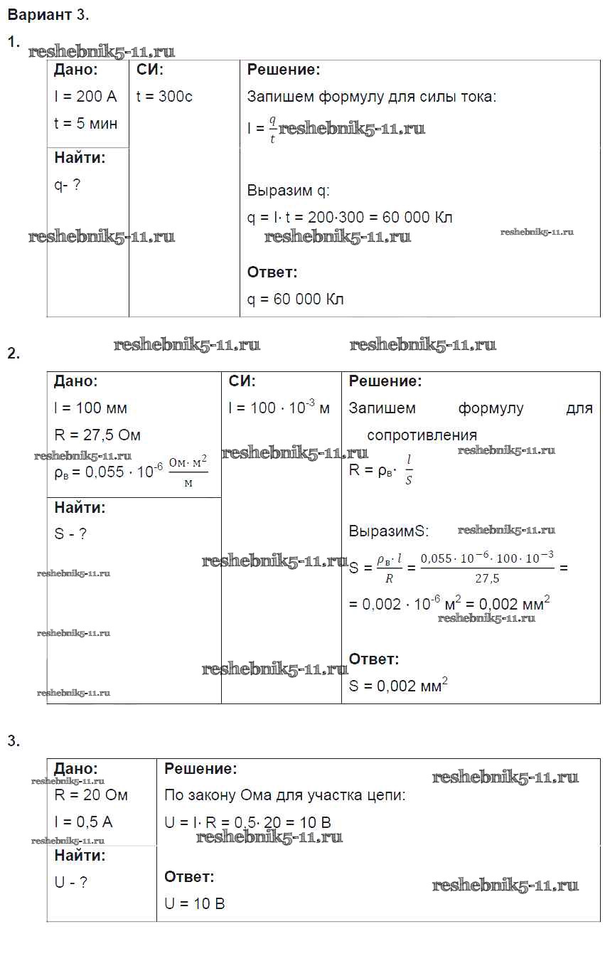 Готовая домашняя работа с ответами по Физике за 8 класс Марон Дидактические материалы Вертикаль Дрофа 2016 ФГОС - СР №8. Сила тока. Напряжение. Закон Ома для участка цепи Варианты 3