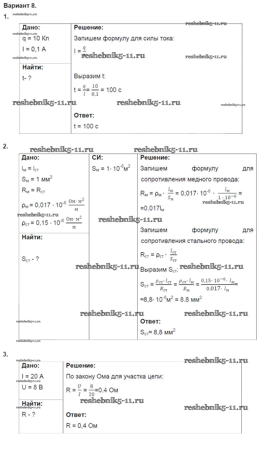 Готовая домашняя работа с ответами по Физике за 8 класс Марон Дидактические материалы Вертикаль Дрофа 2016 ФГОС - СР №8. Сила тока. Напряжение. Закон Ома для участка цепи Варианты 8