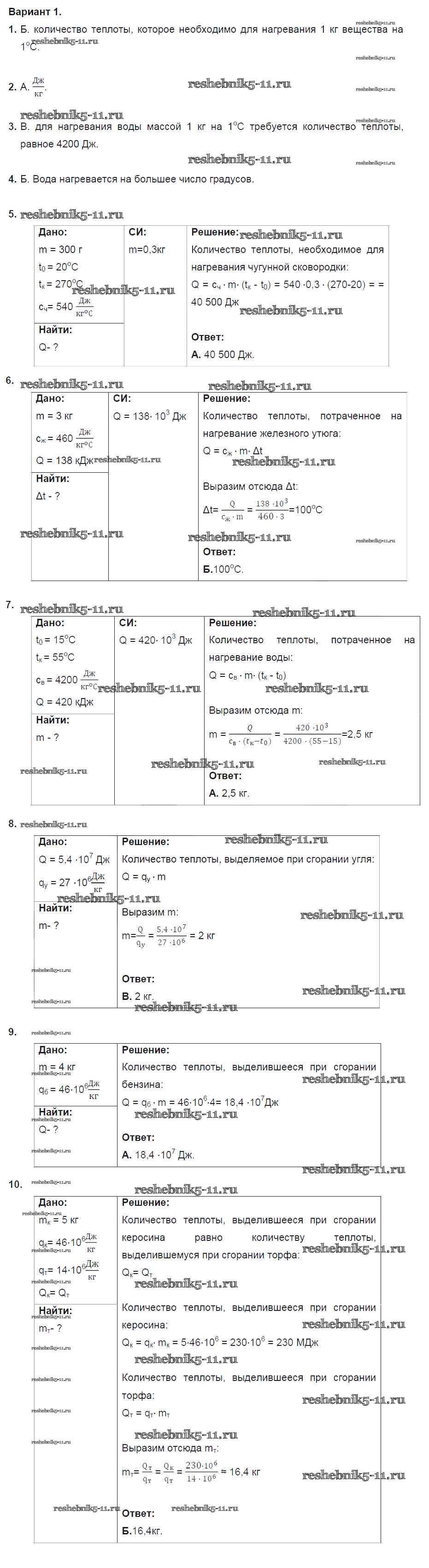 Готовая домашняя работа с ответами по Физике за 8 класс Марон Дидактические материалы Вертикаль Дрофа 2016 ФГОС - Тест №2. Количество теплоты. Энергия топлива. Варианты 1