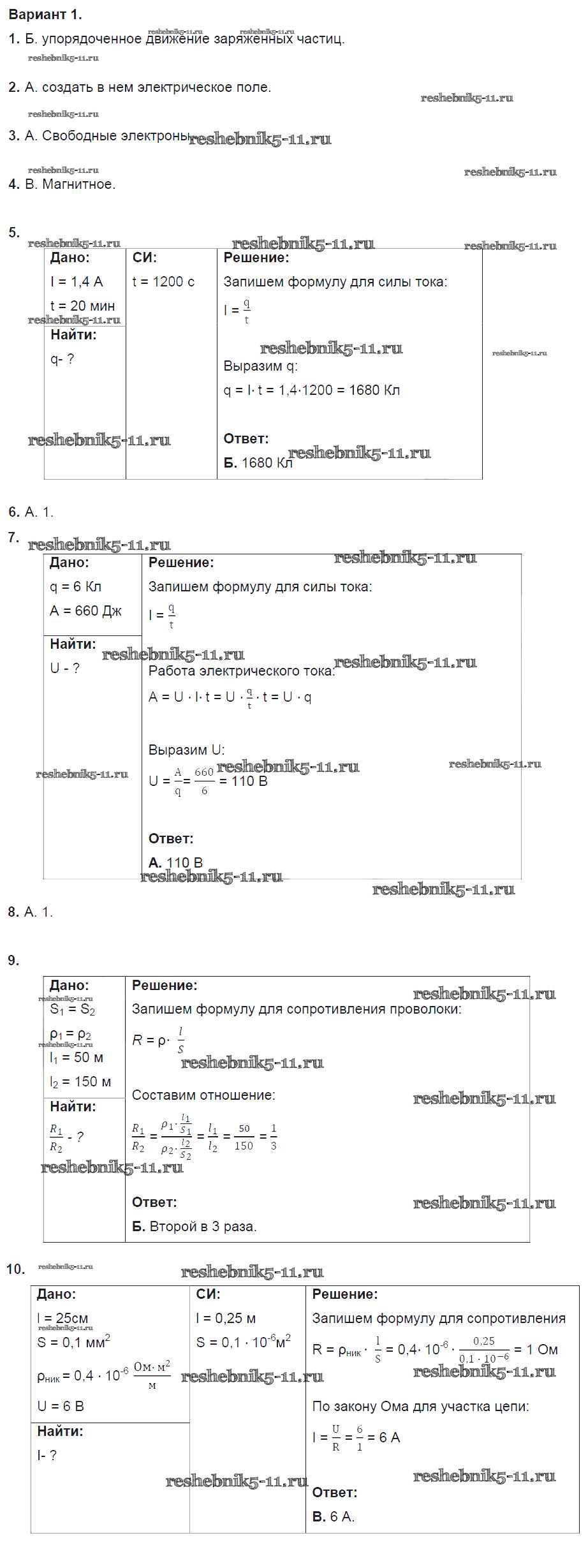Готовая домашняя работа с ответами по Физике за 8 класс Марон Дидактические материалы Вертикаль Дрофа 2016 ФГОС - Тест №6.Сила тока. Напряжение. Сопротивление. Закон Ома для участка цепи. Варианты 1