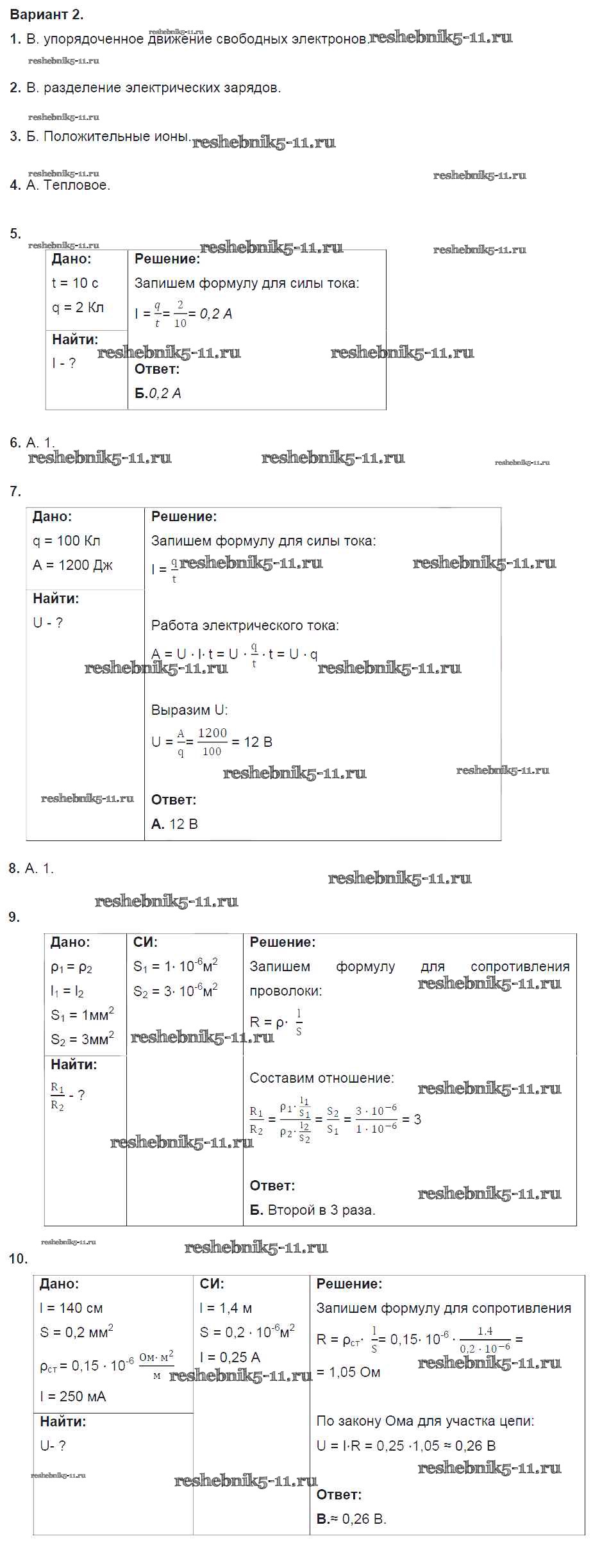 Готовая домашняя работа с ответами по Физике за 8 класс Марон Дидактические материалы Вертикаль Дрофа 2016 ФГОС - Тест №6.Сила тока. Напряжение. Сопротивление. Закон Ома для участка цепи. Варианты 2