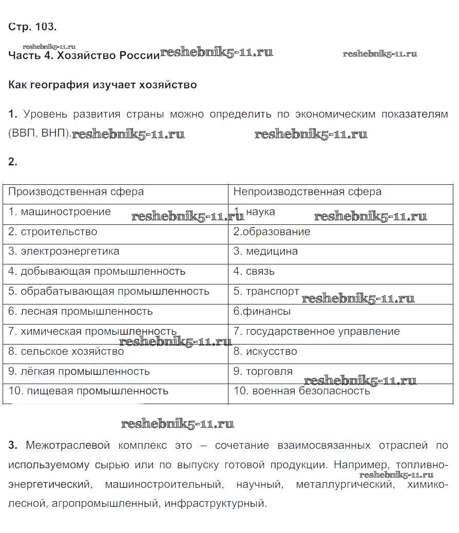 Готовая домашняя работа с ответами по Географии за 8 класс Баринова, Дронов Рабочая тетрадь УМК Дрофа 2017 ФГОС - Страницы 103