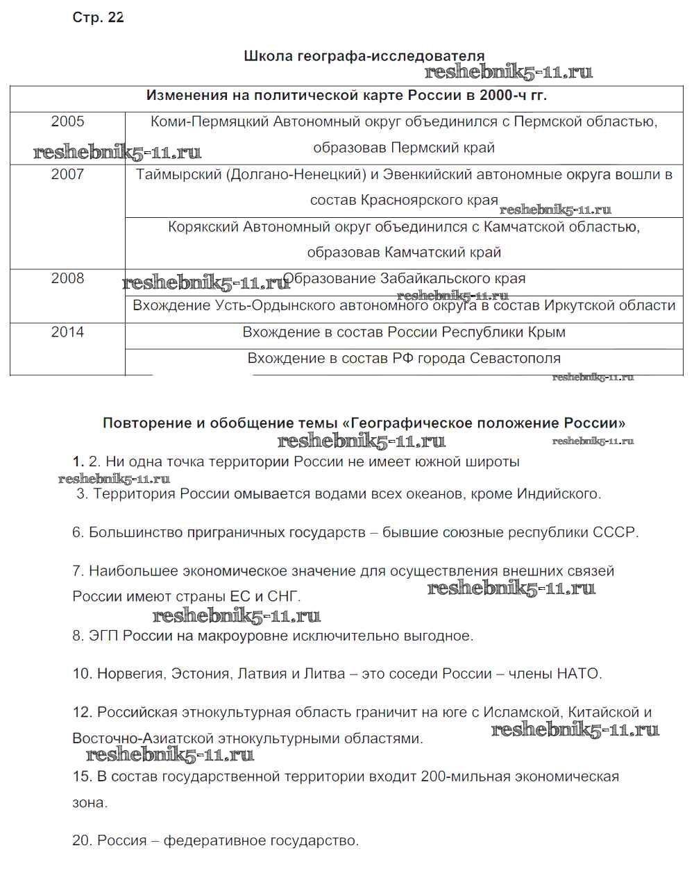 Готовая домашняя работа с ответами по Географии за 8 класс Пятунин, Таможняя Рабочая тетрадь Алгоритм успеха Часть 1, 2 Вентана-граф 2017 ФГОС - Часть 1. Страницы 22