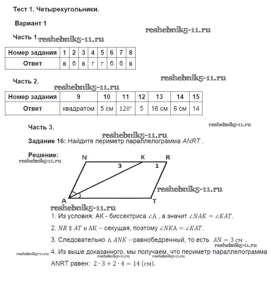 Готовая домашняя работа с ответами по Геометрии за 8 класс Фарков Тесты УМК Экзамен 2014 ФГОС - Глава 1. Четырехугольники вариант №1