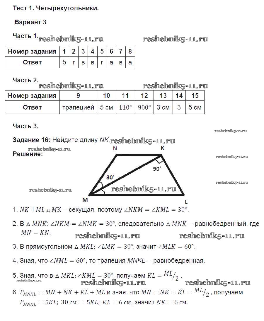 Готовая домашняя работа с ответами по Геометрии за 8 класс Фарков Тесты УМК Экзамен 2014 ФГОС - Глава 1. Четырехугольники вариант №3