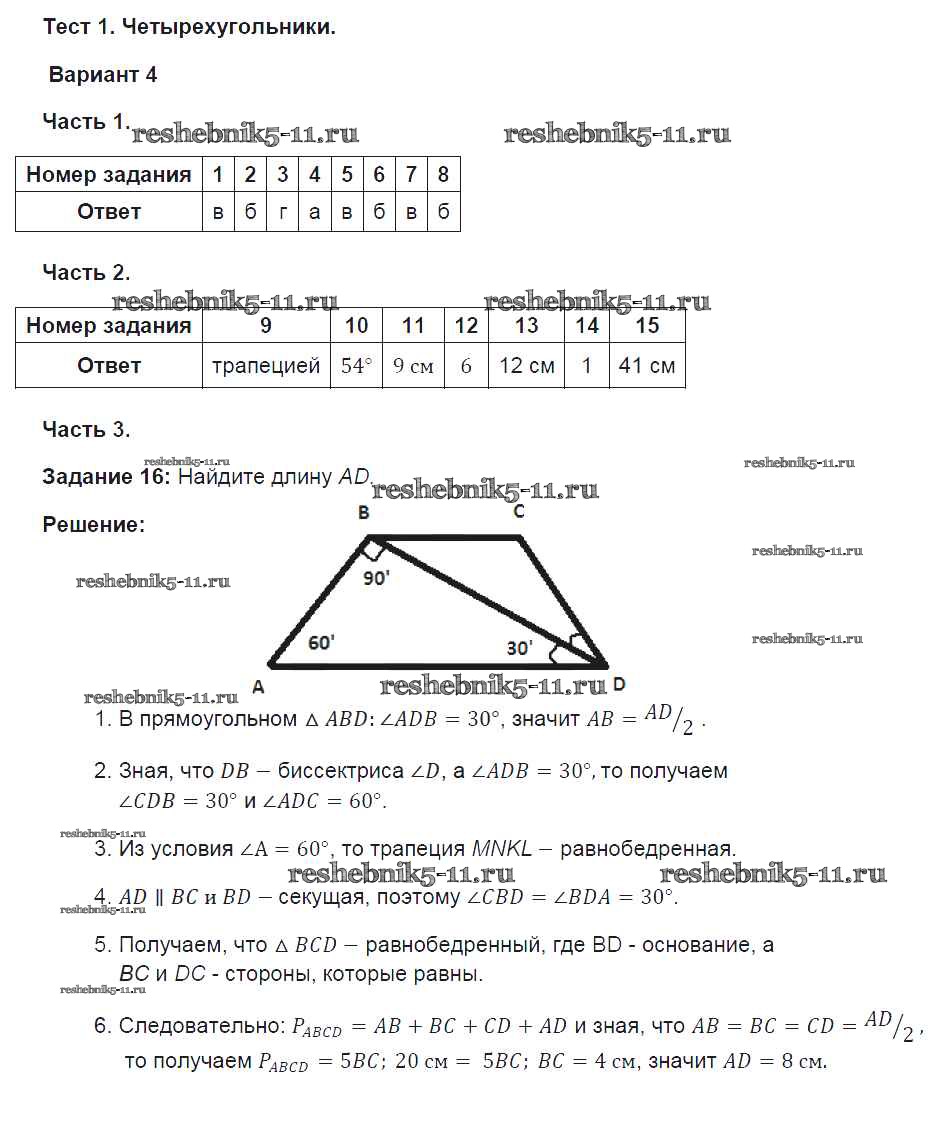Готовая домашняя работа с ответами по Геометрии за 8 класс Фарков Тесты УМК Экзамен 2014 ФГОС - Глава 1. Четырехугольники вариант №4