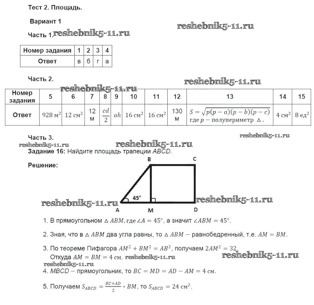 Готовая домашняя работа с ответами по Геометрии за 8 класс Фарков Тесты УМК Экзамен 2014 ФГОС - Глава 2. Площадь вариант №1
