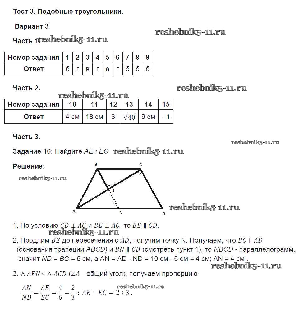 Готовая домашняя работа с ответами по Геометрии за 8 класс Фарков Тесты УМК Экзамен 2014 ФГОС - Глава 3. Подобные треугольники вариант №3