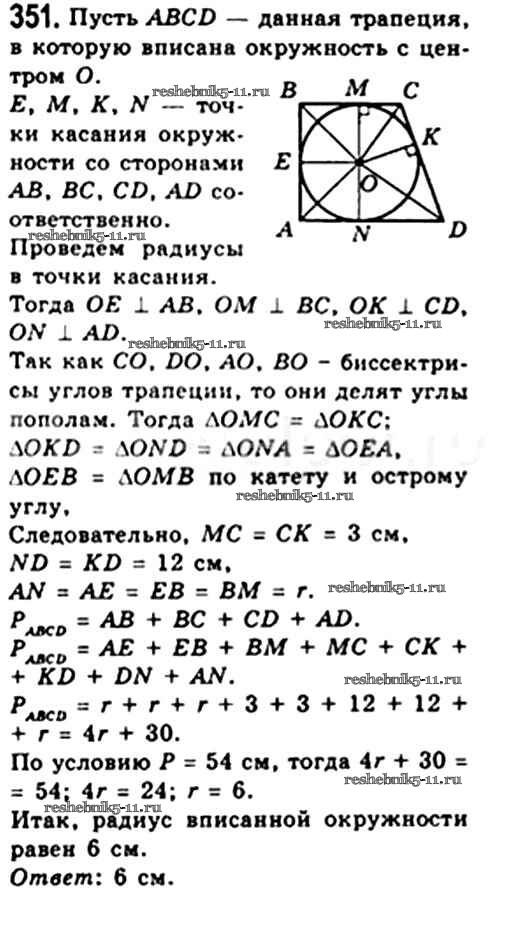 Готовая домашняя работа с ответами по Геометрии за 8 класс Мерзляк, Полонский, Якир Учебник Алгоритм успеха Вентана-граф 2015 ФГОС - § 10. Описанная и вписанная окружности четырехугольника 351