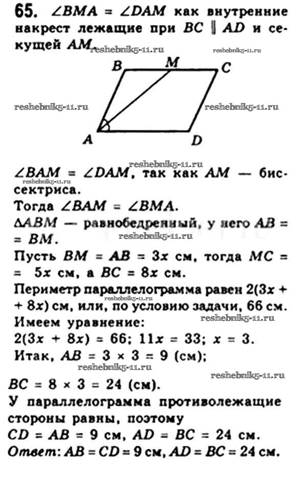 Готовая домашняя работа с ответами по Геометрии за 8 класс Мерзляк, Полонский, Якир Учебник Алгоритм успеха Вентана-граф 2015 ФГОС - § 2. Параллелограмм. Свойства параллелограмма 65
