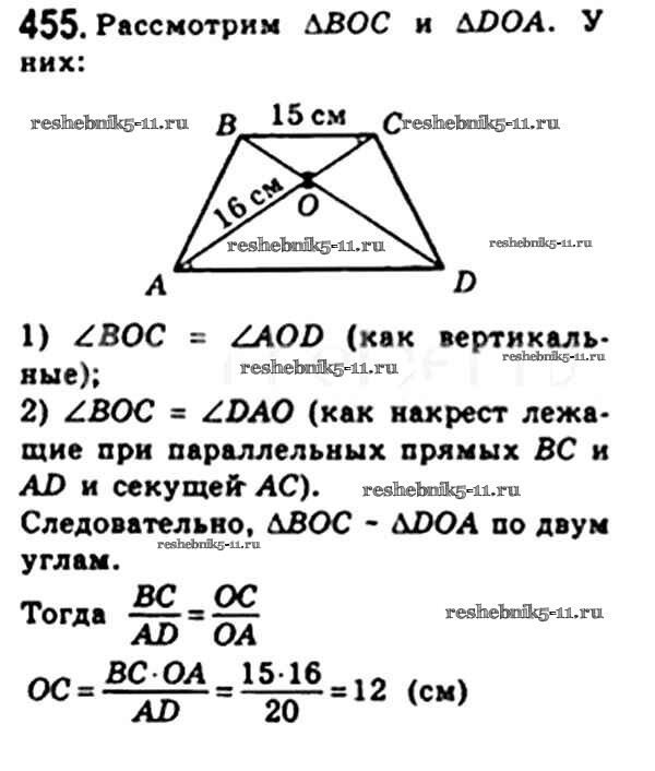 Готовая домашняя работа с ответами по Геометрии за 8 класс Мерзляк, Полонский, Якир Учебник Алгоритм успеха Вентана-граф 2015 ФГОС - § 13. Первый признак подобия треугольника. Свойство пересекающихся хорд. Свойство касательной и секущей. Теорема Менелая. Теорема Птолемея. 455