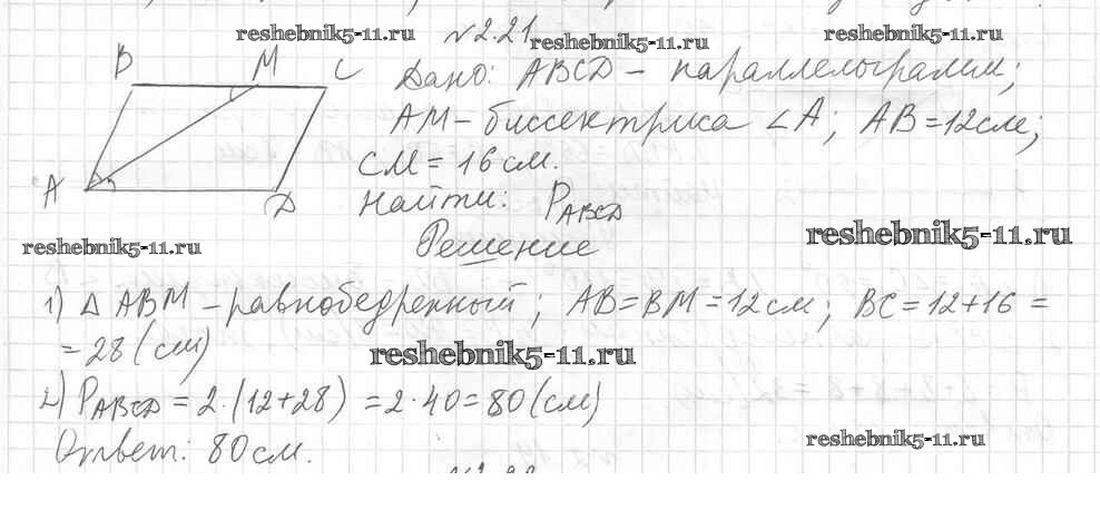 Готовая домашняя работа с ответами по Геометрии за 8 класс Мерзляк, Поляков Учебник Алгоритм успеха Углубленный уровень Вентана-граф 2020 ФГОС - § 2. Параллелограмм и его свойства 21