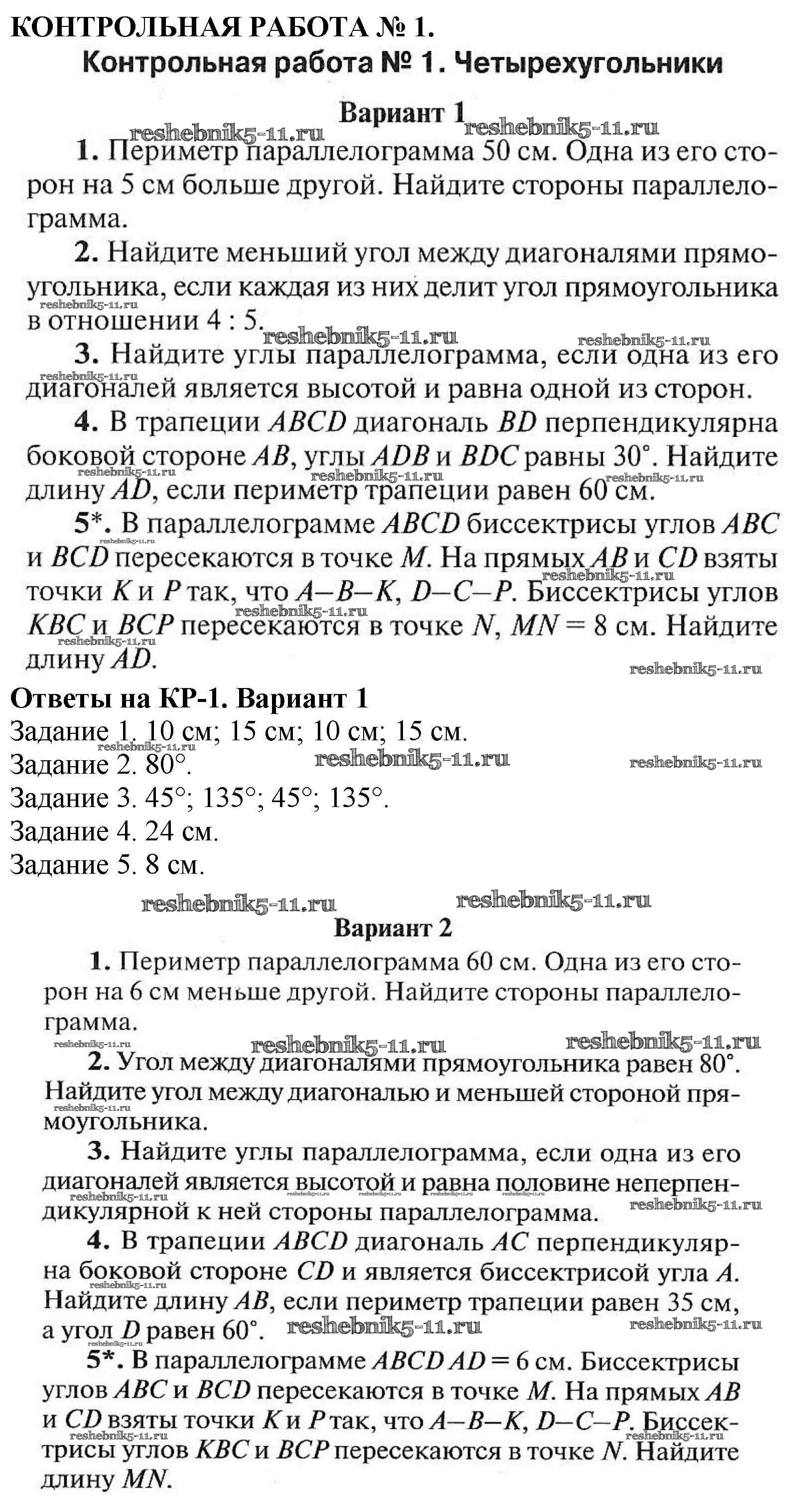 Готовая домашняя работа с ответами по Геометрии за 8 класс Гаврилова Контрольно-измерительные материалы (КИМ) ВАКО 2018 ФГОС - Контрольные работы КР-1
