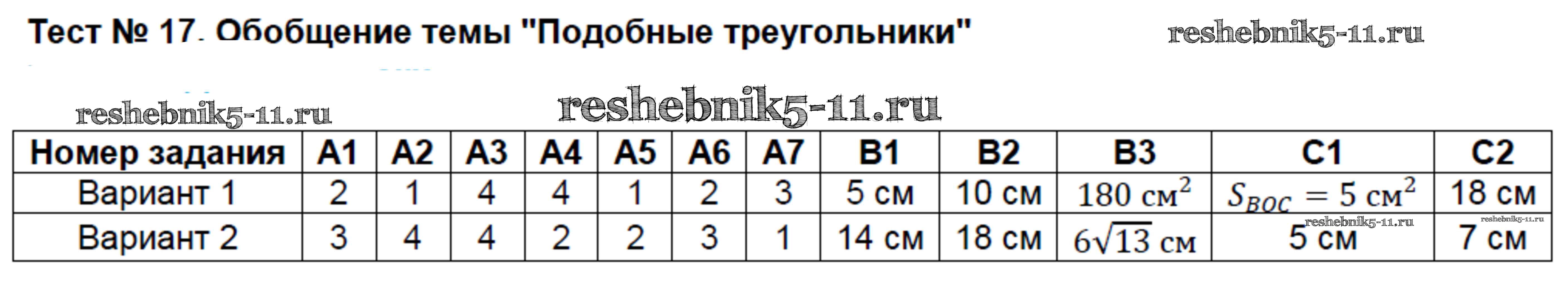 Готовая домашняя работа с ответами по Геометрии за 8 класс Гаврилова Контрольно-измерительные материалы (КИМ) ВАКО 2018 ФГОС - Тесты Тест №17. Обобщение темы - Подобные треугольники