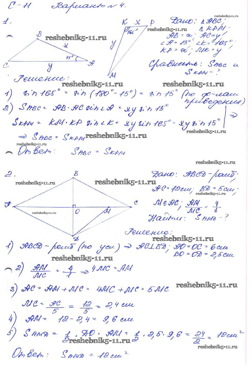 Готовая домашняя работа с ответами по Геометрии за 8 класс Зив, Мейлер Дидактические материалы Просвещение 2016 ФГОС - СР №11. Площадь треугольника вариант-4
