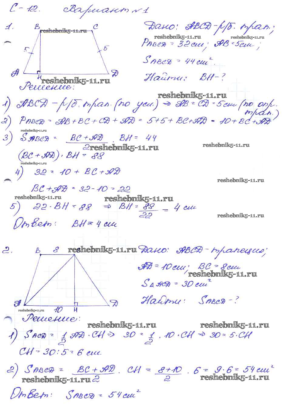 Готовая домашняя работа с ответами по Геометрии за 8 класс Зив, Мейлер Дидактические материалы Просвещение 2016 ФГОС - СР №12. Площадь трапеции вариант-1