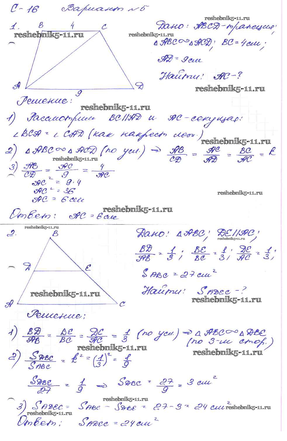Готовая домашняя работа с ответами по Геометрии за 8 класс Зив, Мейлер Дидактические материалы Просвещение 2016 ФГОС - СР №16. Определение подобных треугольников вариант-5