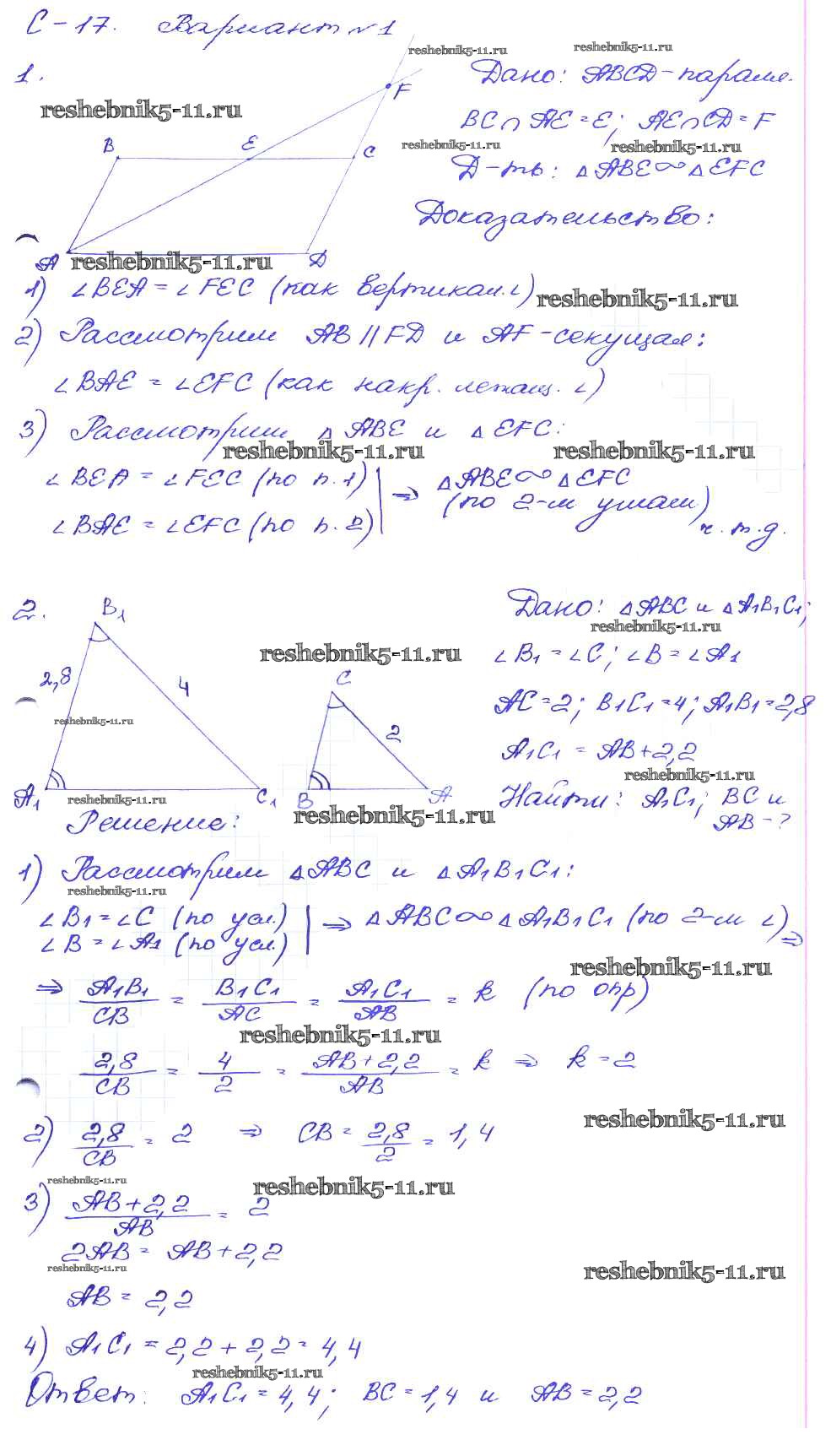 Готовая домашняя работа с ответами по Геометрии за 8 класс Зив, Мейлер Дидактические материалы Просвещение 2016 ФГОС - СР №17. Первый признак подобия треугольников вариант-1