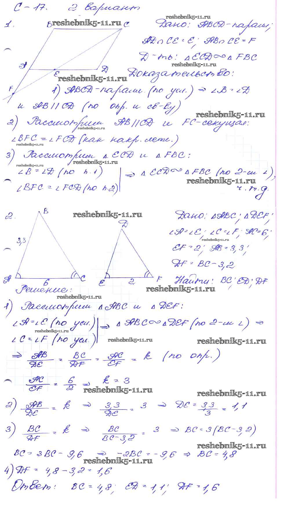 Готовая домашняя работа с ответами по Геометрии за 8 класс Зив, Мейлер Дидактические материалы Просвещение 2016 ФГОС - СР №17. Первый признак подобия треугольников вариант-2