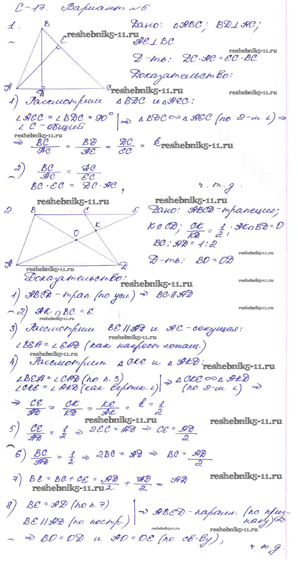 Готовая домашняя работа с ответами по Геометрии за 8 класс Зив, Мейлер Дидактические материалы Просвещение 2016 ФГОС - СР №17. Первый признак подобия треугольников вариант-5