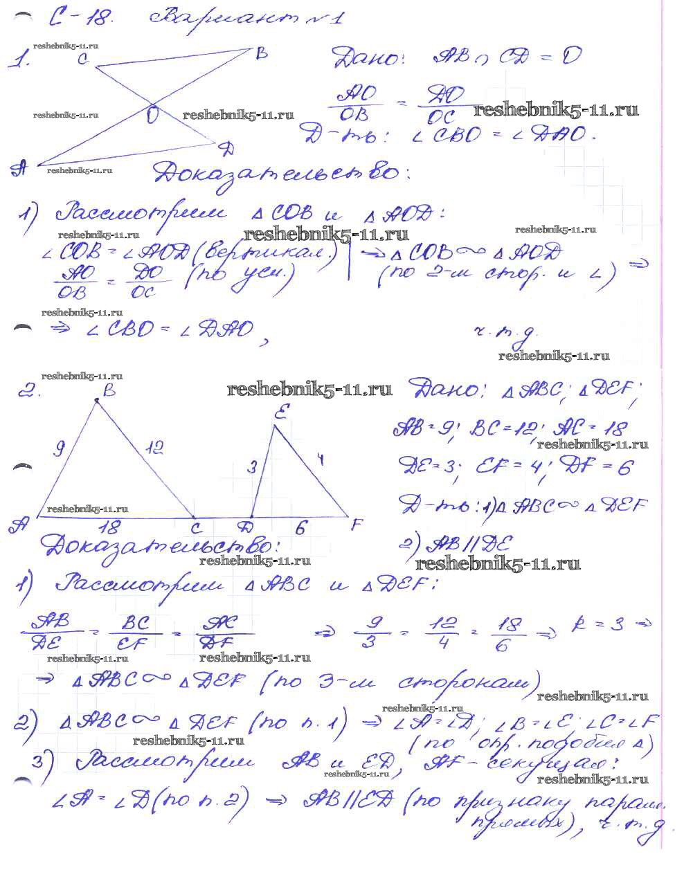 Готовая домашняя работа с ответами по Геометрии за 8 класс Зив, Мейлер Дидактические материалы Просвещение 2016 ФГОС - СР №18. Второй и третий признак подобия треугольников вариант-1