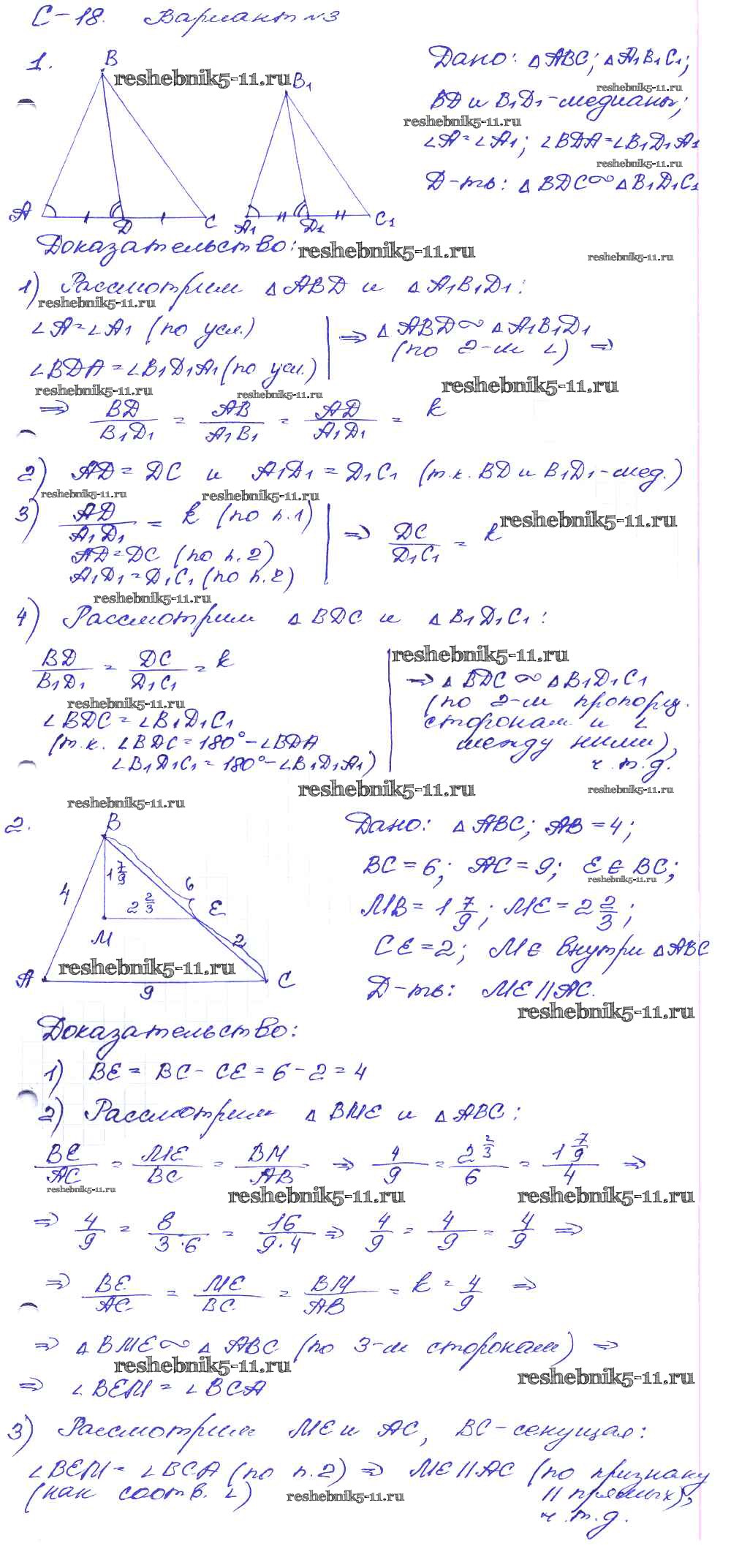 Готовая домашняя работа с ответами по Геометрии за 8 класс Зив, Мейлер Дидактические материалы Просвещение 2016 ФГОС - СР №18. Второй и третий признак подобия треугольников вариант-3