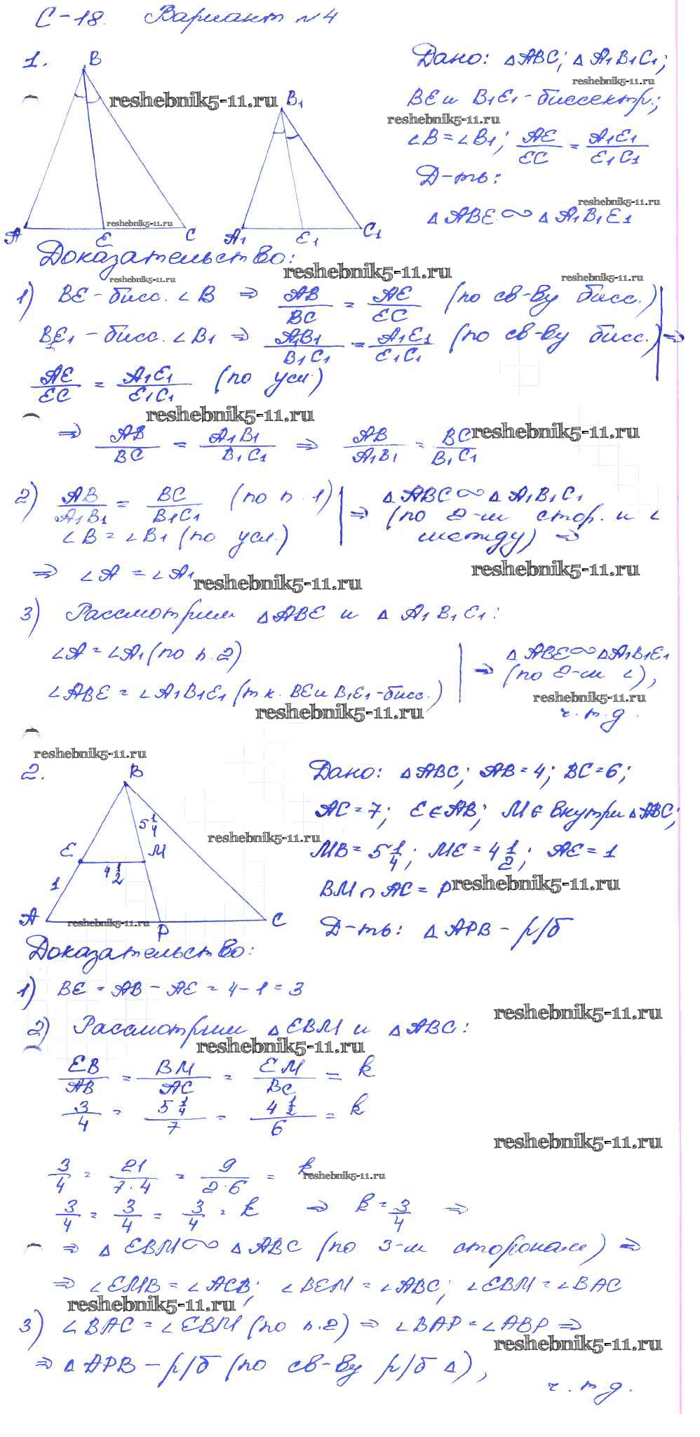 Готовая домашняя работа с ответами по Геометрии за 8 класс Зив, Мейлер Дидактические материалы Просвещение 2016 ФГОС - СР №18. Второй и третий признак подобия треугольников вариант-4