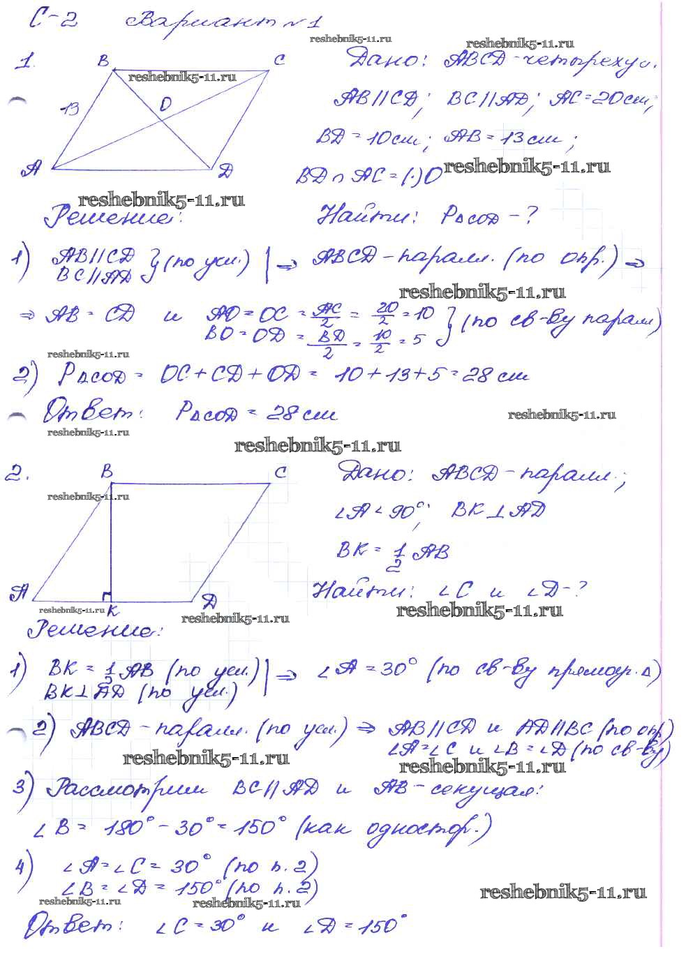 Готовая домашняя работа с ответами по Геометрии за 8 класс Зив, Мейлер Дидактические материалы Просвещение 2016 ФГОС - СР №2. Параллелограмм и его свойства вариант-1