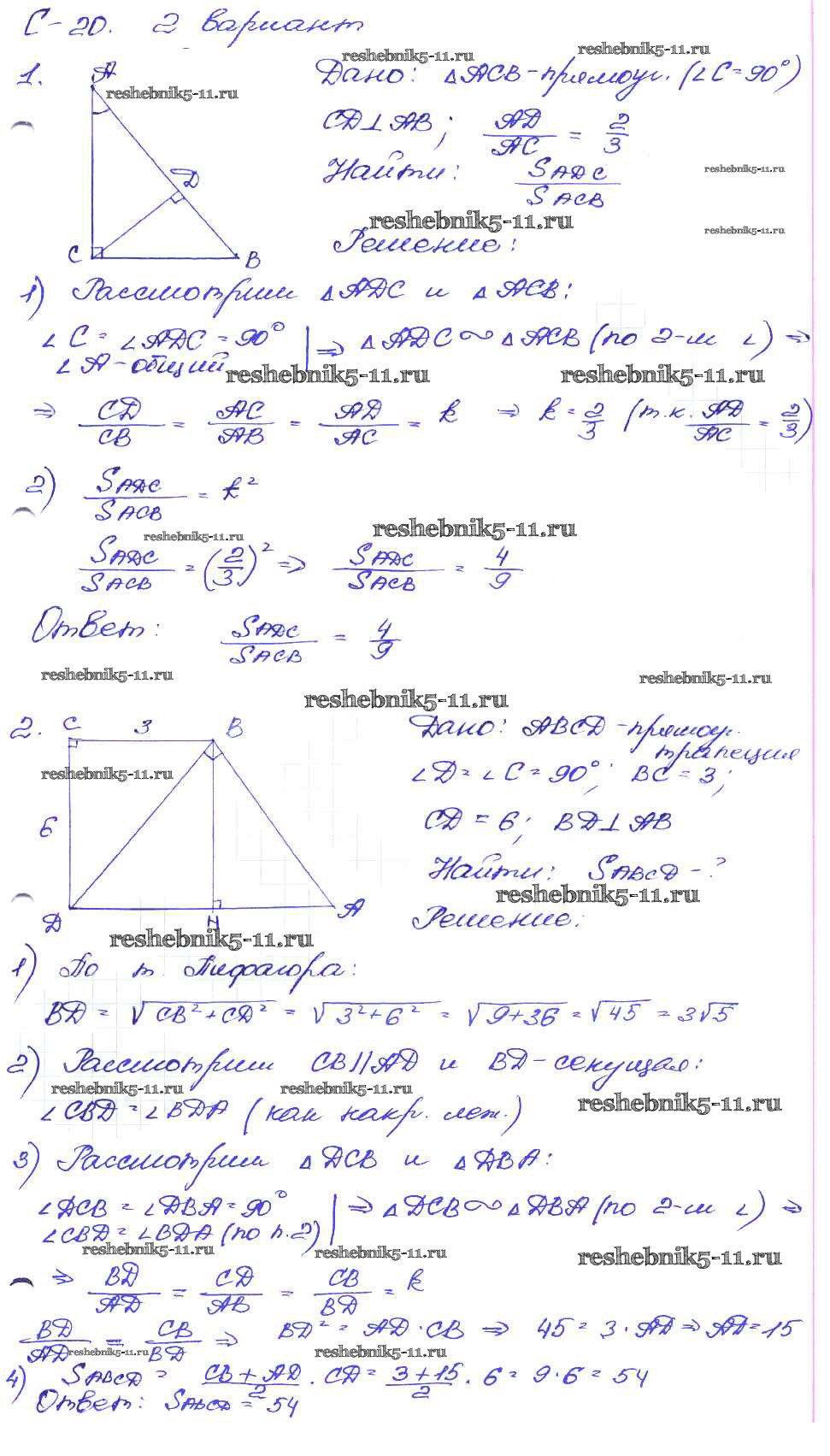 Готовая домашняя работа с ответами по Геометрии за 8 класс Зив, Мейлер Дидактические материалы Просвещение 2016 ФГОС - СР №20. Пропорциональные отрезки в прямоугольном треугольнике вариант-2