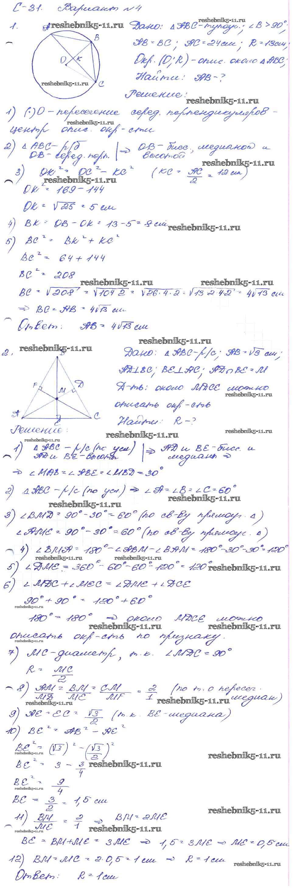 Готовая домашняя работа с ответами по Геометрии за 8 класс Зив, Мейлер Дидактические материалы Просвещение 2016 ФГОС - СР №31. Описанная окружность вариант-4