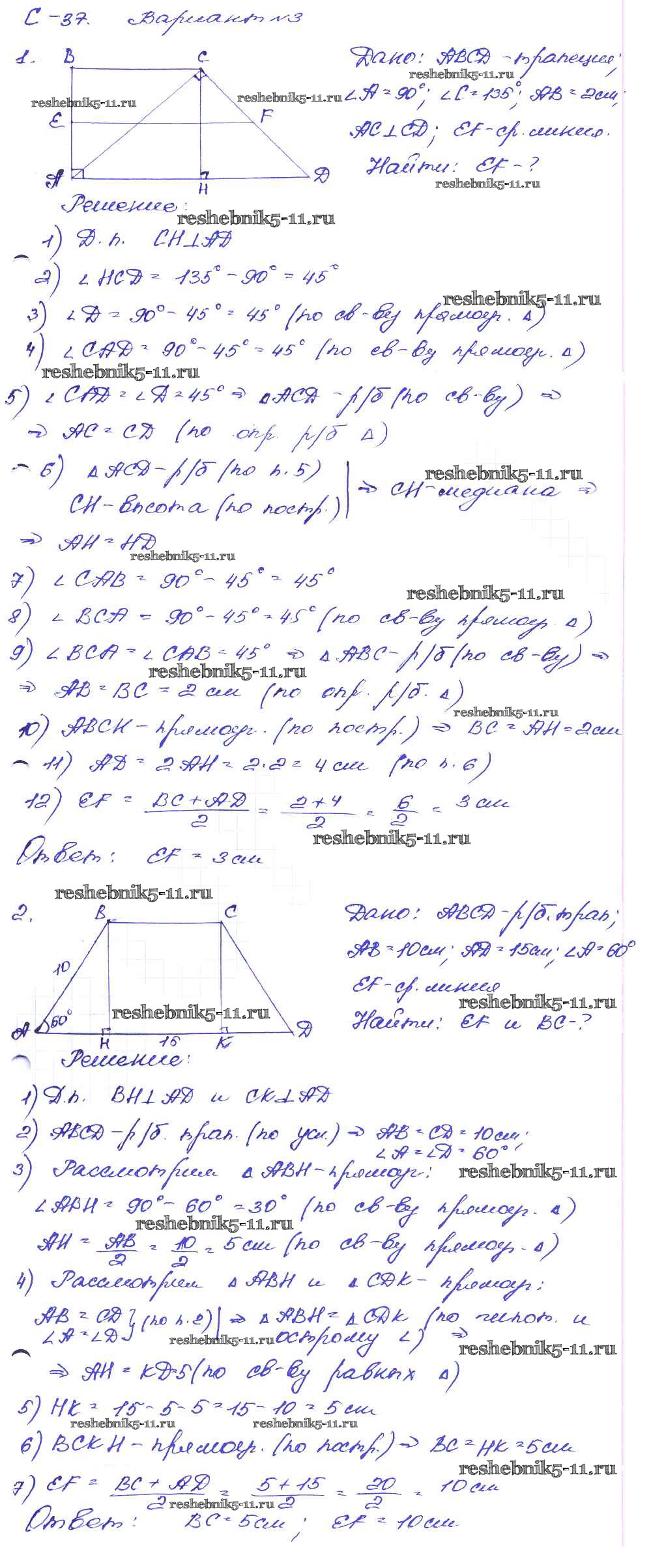 Готовая домашняя работа с ответами по Геометрии за 8 класс Зив, Мейлер Дидактические материалы Просвещение 2016 ФГОС - СР №37. Средняя линия трапеции вариант-3