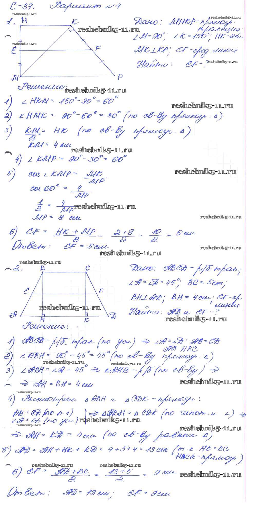 Готовая домашняя работа с ответами по Геометрии за 8 класс Зив, Мейлер Дидактические материалы Просвещение 2016 ФГОС - СР №37. Средняя линия трапеции вариант-4