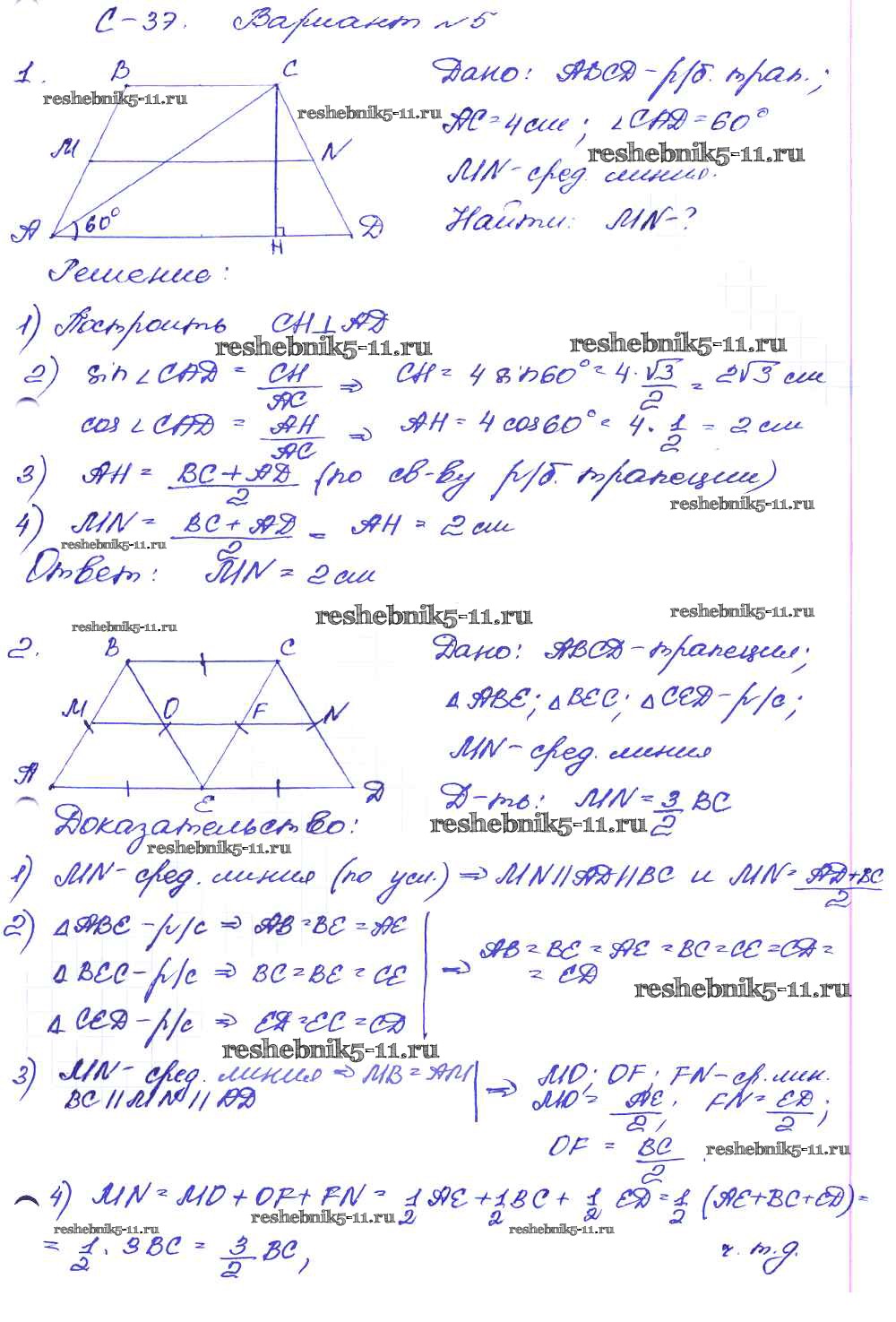 Готовая домашняя работа с ответами по Геометрии за 8 класс Зив, Мейлер Дидактические материалы Просвещение 2016 ФГОС - СР №37. Средняя линия трапеции вариант-5