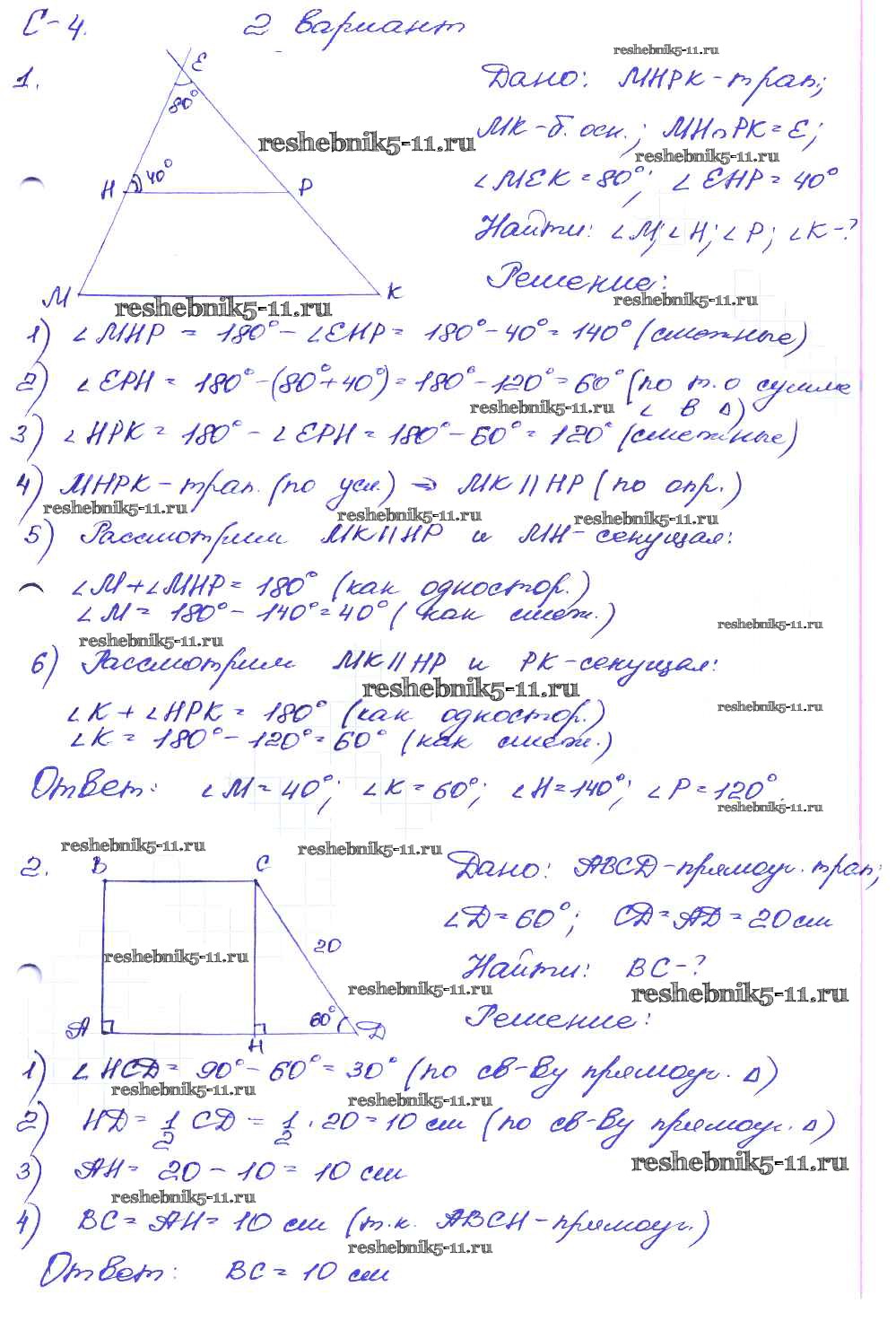 Готовая домашняя работа с ответами по Геометрии за 8 класс Зив, Мейлер Дидактические материалы Просвещение 2016 ФГОС - СР №4. Трапеция вариант-2
